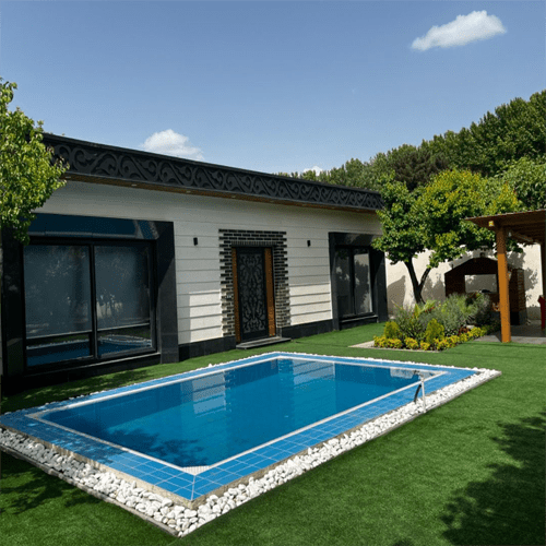 فروش ویلا جابان با متراژکلی ۸۰۰ متر وبنای حقیقی ۱۳۵ متری ۲ خوابه نما تمام سنگ، دارای آب کشاورزی، استخر، سونا، جکوزی و …